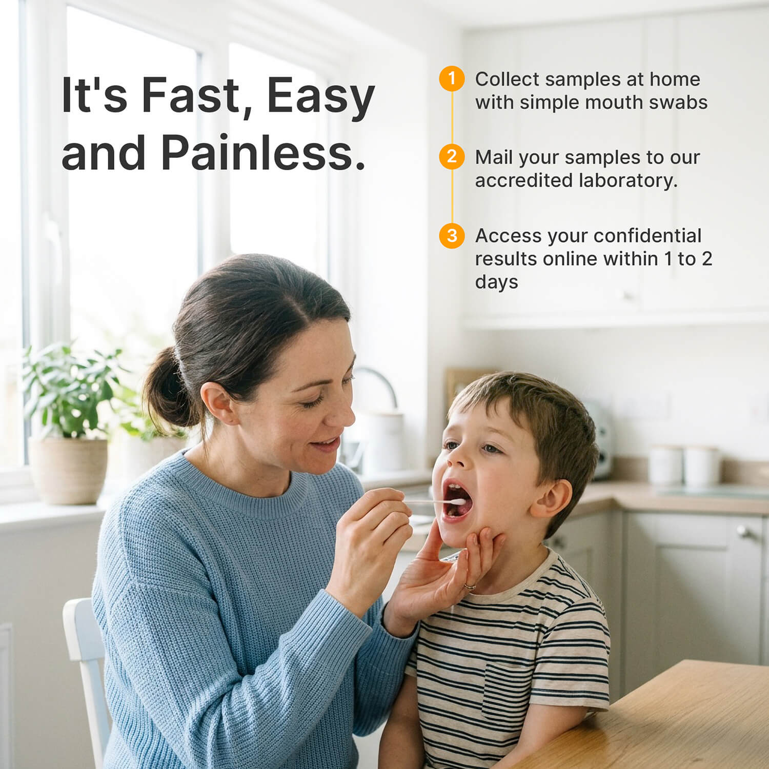 The collection process is extremely simple and painless. Your kit includes easy-to-use cheek swabs (similar to Q-tips) that you gently rub against the inside of the cheek for about 30 seconds. This collects enough DNA for testing without any blood or needles. The process works for everyone, including infants. Our kit includes clear instructions, and our customer service team is available if you need assistance.